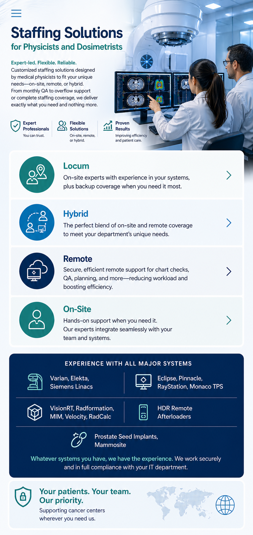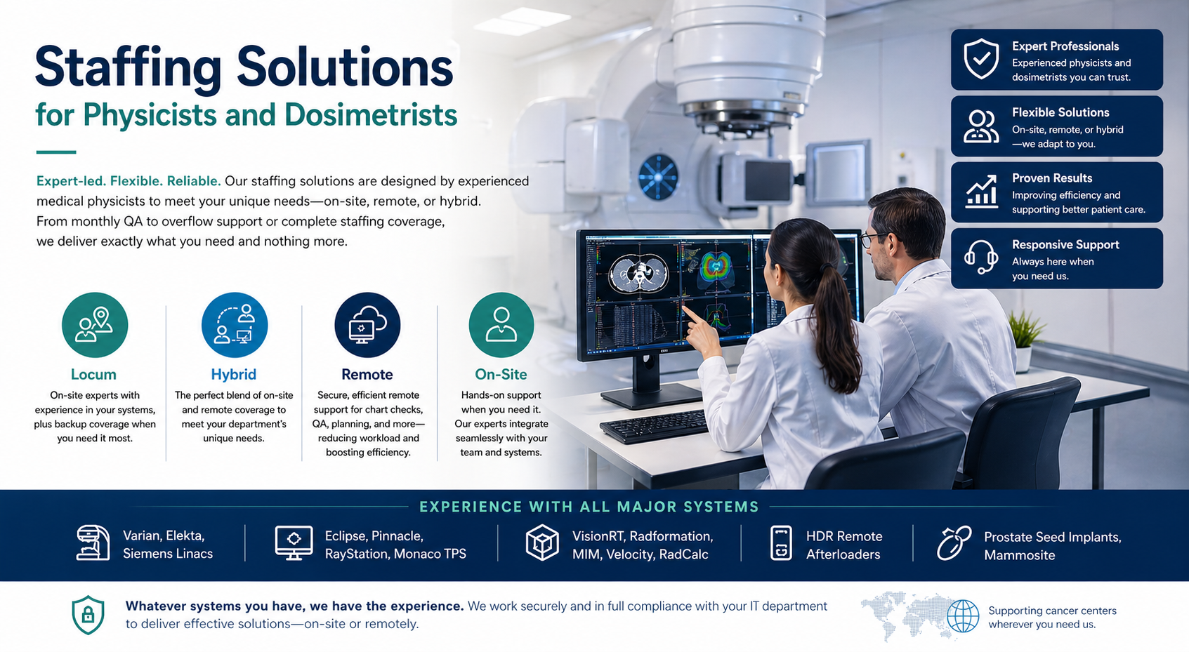 Our onsite services provide reliable, hands-on support for your radiation oncology department when and where you need it most. Whether you’re facing staffing gaps, increased workload, or require in-person expertise, our highly qualified medical physicists and dosimetrists integrate seamlessly into your team. Each professional is thoroughly vetted and experienced with a wide range of technologies, ensuring efficient workflow, compliance, and continuity of care. We focus on delivering flexible, high-quality onsite coverage that supports your staff, enhances operations, and helps your facility perform at its best.